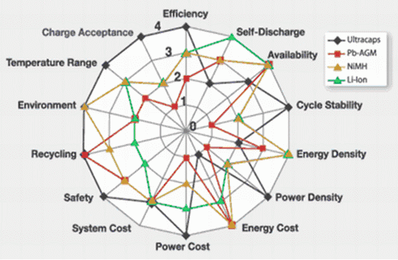Li離子、NiMH等新型電池可以提供一個可靠的能量儲存方案,并且已經(jīng)在很多領(lǐng)域中廣泛使用。眾所周知,化學電池是通過電化學反應(yīng),產(chǎn)生法拉第電荷轉(zhuǎn)移來儲存電荷的,使用壽命較短,并且受溫度影響較大,這也同樣是采用鉛酸電池(蓄電池)的設(shè)計者所面臨的困難。同時,大電流會直接影響這些電池的壽命,因此,對于要求長壽命、高可靠性的某些應(yīng)用,這些基于化學反應(yīng)的電池就顯出種種不足。