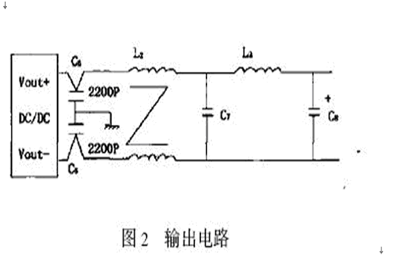 二次電源的輸出高頻噪聲(表現(xiàn)為紋波)可能向空間輻射成為輻射噪聲,過大時造成作為負載的電子設(shè)備出現(xiàn)故障。為此,二次直流電源的輸出應包括平滑電路和EMI濾波電路。電路圖如圖2所示。