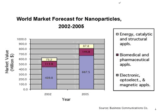 納米科技是21世紀(jì)科技發(fā)展的重要技術(shù)領(lǐng)域,藉由納米科技將創(chuàng)造另一波技術(shù)創(chuàng)新及產(chǎn)業(yè)革命。近年來歐美日各國均投入大量人力與經(jīng)費,進行納米材料與應(yīng)用技術(shù)的開發(fā)。納米材料應(yīng)用的范圍甚廣,包含化工、民生、消費性電子、光學(xué)、生物、制藥、能源等產(chǎn)業(yè)的應(yīng)用。根據(jù)美國市調(diào)機構(gòu)Business Communication之調(diào)查分析結(jié)果,納米材料在整體產(chǎn)業(yè)的應(yīng)用上,于2005年市場需求值可達(dá)9億美元,如(圖一)。諾貝爾獎得主Dr. Smalley表示,未來五十年人類面臨十大問題中,以能源居首,能源需求量成長了3~4倍,而納米技術(shù)將可帶動納米能源的革命性發(fā)展與突破,包括納米鋰電池、太陽能電池、燃料電池、儲氫系統(tǒng)、光觸媒、光電池等等應(yīng)用。