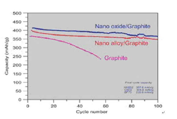 目前商品化的鋰電池負(fù)極材料,主要種類包括石墨化碳、人工石墨、硬碳及碳纖維等。其中石墨化碳(如介穩(wěn)定相碳狀碳)的市場佔有率最高約30%,其材料價格高(每公斤30~32美金)、容量適中、壽命佳,目前被大量使用于鋰電池負(fù)極材料;然而其容量已達(dá)技術(shù)極限,非得使用更高容量的石墨碳材或合金材料,才能獲得高能量密度的鋰電池。目前高容量負(fù)極材料的開發(fā),主要包括利用高能量機械合金化研磨(high-energy mechanical alloying) 技術(shù),將金屬或合金材料進行高能量研磨,以獲得納米結(jié)構(gòu)金屬或合金材料;或?qū)⑻挤郾砻驽兩弦粚蛹{米氧化物及合金材料,以形成納米復(fù)合負(fù)極材料,如(圖三)。
