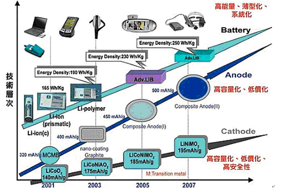 鋰二次電池雖然已廣泛使用于3C產(chǎn)品上,然而隨著筆記型電腦使用1GHz CPU而增加耗電量,以及LCD螢?zāi)怀叽缂哟蟆⒔馕龆忍岣摺⑹褂酶呷萘坑驳癉VD-ROM等趨勢,未來筆記型電腦整體功率消耗明顯提高,因此對鋰電池主要的技術(shù)提升需求,包括提升電池能量密度、降低重量與智慧型電源管理。未來行動電話從2G提升至3G時,不論是GSM、WCDMA等系統(tǒng),所需要的電池能量密度都需要明顯的增加。目前薄型鋰電池系統(tǒng)的重量能量密度雖有顯著的提升,但主要是罐體外殼的輕量化,在電極材料的性能提升上,進展較少。針對3G所強調(diào)的高體積能量密度>420 Wh/L要求,目前薄型鋰電池的體積能量密度(340~360 Wh/L)仍無法符合其規(guī)格目標(biāo)。未來各種多功能的手錶(Multifunctional Watch),將具有Phone、DSC、MP3等功能,此時對能量密度高且薄型化鋰電池的需求更加迫切,另一方面3G行動電話與結(jié)合電腦、PDA、行動電話等功能的行動資訊與通訊終端產(chǎn)品(Mobile IA),將大量地被使用,對具有高能量密度的鋰電池同樣迫切需求,如(圖二)。因此開發(fā)高容量及高功率的納米級鋰電池材料,并應(yīng)用于新世代的納米鋰電池上,是全世界鋰電池業(yè)者目前最重要需突破的目標(biāo)。