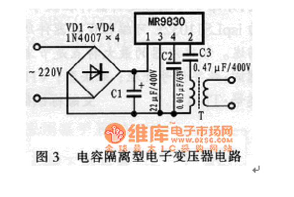 圖3和圖4是兩種不同接法的電子變壓器電路,其原理都是將MR9830的2腳輸出的高頻電壓由鐵氧體變壓器T降壓和隔離后輸出。其中,圖3是將MR9830的2腳輸出由C3隔離后得到電源負端形成回路。圖4則是利用C3、C4制造一個人為的“中性點”,而讓MR9830的2腳輸出的高頻電壓經T的初級繞組到此“中性點”形成回路。經實際測試發現:圖3輸出的電壓