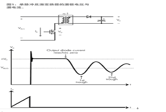 圖1說明了在非連續(xù)導通模式下工作的電流模式反激變換器的漏極波形,這里只施加了一個門脈沖。在第一個時間間隔,漏電流上升,直到達到所需的電流強度,此時電源開關關閉,回轉變壓器中的漏電感與節(jié)點電容形成諧振。這會導致漏電感浪涌,該浪涌受箝位電路限制,在電感浪涌消失后,漏極電壓返回到等于輸入電壓加上初級線圈感應電壓的水平。如果忽略初級線圈電感和節(jié)點電容的影響,當輸出二極管中的電流降到零時,漏極電壓立即降到總線電壓,但漏極電壓衰減到如圖1所示的水平。