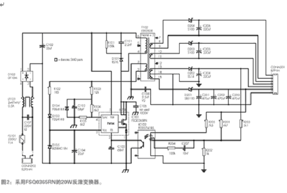圖2說明了Fairchild全球電源資源中心德國的設計的示例應用,R103-5、D104和C103為檢測最小漏極電壓所需的額外元件,F(xiàn)OD2741為誤差放大器,它在同一封裝中結合了標準光耦合器和工業(yè)標準的431參考,其它元件為反激變換器的標準部分。