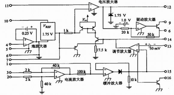 UC3907的內(nèi)部結(jié)構(gòu)如圖1所示。可分為電壓環(huán)與電流環(huán)(包括均流控制) 兩部分。其中電壓環(huán)由電壓放大器、接地放大器和驅(qū)動(dòng)放大器構(gòu)成。電流環(huán)由電流放大器、緩沖放大器、調(diào)節(jié)放大器和狀態(tài)指示構(gòu)成。