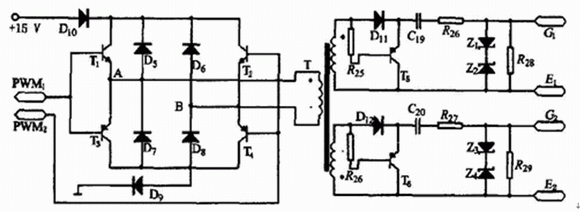 該系統(tǒng)主電路的開關(guān)管使用IGBT, 用脈沖變壓器作驅(qū)動(dòng)。當(dāng)IGBT容量較小時(shí)UC3846的11腳和14腳可以直接驅(qū)動(dòng)變壓器; 當(dāng)IGBT容量較大時(shí), 可以采用圖3所示的驅(qū)動(dòng)電路。該驅(qū)動(dòng)電路結(jié)構(gòu)簡單, 具有負(fù)壓關(guān)斷能力, 且驅(qū)動(dòng)功率大。電路中, 二極管D9、D10有助于T1~T4的關(guān)斷。