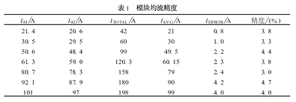 用兩個(gè)電源模塊作并聯(lián)實(shí)驗(yàn), 實(shí)驗(yàn)數(shù)據(jù)見表1所列。由表1知, 它的負(fù)載均流精度(負(fù)載不平衡度)控制在5%以內(nèi)。