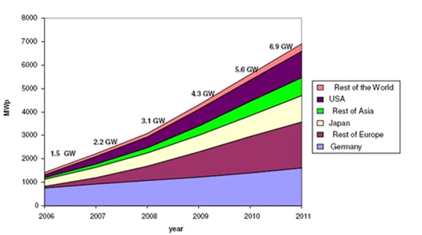 在中國(guó),據(jù)報(bào)道2010年以前太陽(yáng)能電池多數(shù)是用于獨(dú)立光伏發(fā)電系統(tǒng),從2011年到2020年,光伏發(fā)電市場(chǎng)主流將會(huì)由獨(dú)立發(fā)電系統(tǒng)轉(zhuǎn)向并網(wǎng)發(fā)電系統(tǒng)。未來(lái)15年內(nèi),中國(guó)將投資2000多億元,充分利用西部地區(qū)和沿海地區(qū)太陽(yáng)日照時(shí)間長(zhǎng)的優(yōu)勢(shì),興建太陽(yáng)能供熱系統(tǒng)、太陽(yáng)能光熱應(yīng)用示范工程和大型太陽(yáng)能光伏發(fā)電站,大力發(fā)展太陽(yáng)能產(chǎn)業(yè)。預(yù)計(jì)到2015年,中國(guó)的光伏產(chǎn)量將達(dá)到1GWp,位居世界先進(jìn)水平,2020年將達(dá)到35GWp。