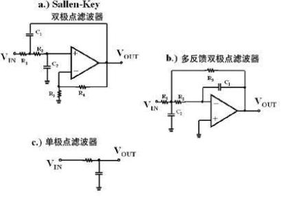 圖4 Sallen-Key (a)和多反饋 (b)濾波器都是2階,都有2個(gè)極點(diǎn)。單極點(diǎn)濾波器(c)是1階濾波器。這些模塊可以級(jí)聯(lián),以生成高階濾波器。