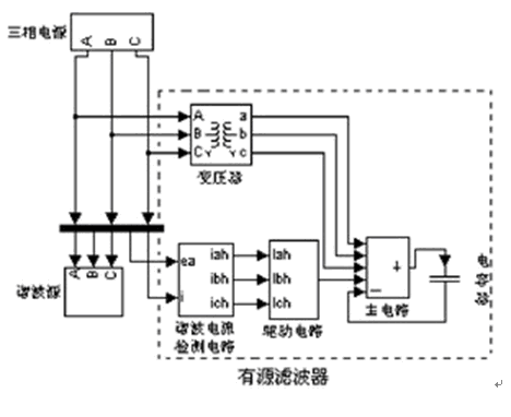 該有源濾波器主要由諧波電流檢測電路、驅(qū)動電路、主電路、電容器和變壓器5大部分組成。變壓器的設(shè)置主要是為調(diào)節(jié)有源電力濾波器交流側(cè)電壓之用。其原理如圖1所示。其中的諧波源模塊是根據(jù)主提升機房實際諧波測試數(shù)據(jù)建成的。