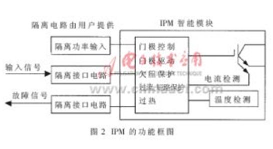 IPM的功能框圖如圖2所示。IPM內置驅動和保護電路,隔離接口電路需用戶自己設計。