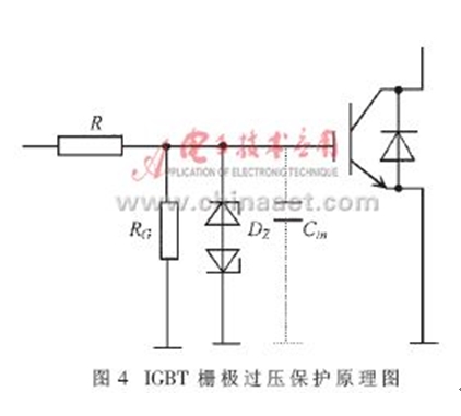 IGBT的驅動設計問題亦即MOSFET的驅動設計問題;設計時應注意以下幾點:①IGBT柵極耐壓一般在±20V左右,因此驅動電路輸出端要給柵極加電壓保護,通常的做法是在柵極并聯穩壓二極管或者電阻。前者的缺陷是將增加等效輸入電容Cin,從而影響開關速度,后者的缺陷是將減小輸入阻抗,增大驅動電流,使用時應根據需要取舍。圖4為IGBT柵極保護原理圖,其中,RG、DZ、Cin分別為等效柵極阻抗、穩壓管和等效輸入電容。②盡管IGBT所需驅動功率很小,但由于MOSFET存在輸入電容Cin,開關過程中需要對電容充放電,因此驅動電路的輸出電流應足夠大,這一點設計者往往忽略。假定開通驅動時,在上升時間tr內線性地對MOSFET輸入電容Cin充電,則驅動電流為