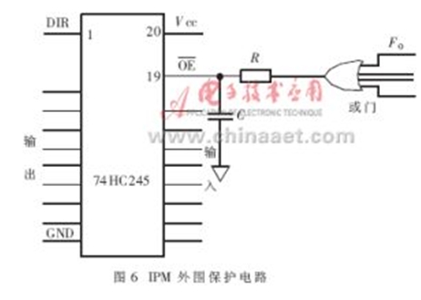 方案一 PWM接口電路前置74HC245、74HC244等帶控制端的三態收發器,如圖6所示。IPM的控制信號經過74HC245的輸入、74HC245的輸出后送至IPM接口電路;各個IPM的故障輸出信號經光耦隔離輸出后得到高電平FO,送入或門,或門輸出經過R-C低通濾波器后,送入74HC245的使能端/OE。IPM正常工作時,或門輸出為低電平,74HC245選通;IPM故障報警時,或門輸出為高電平,74HC245所有輸出置為高阻,封鎖各個IPM的控制信號,關斷IPM;實現了保護功能。