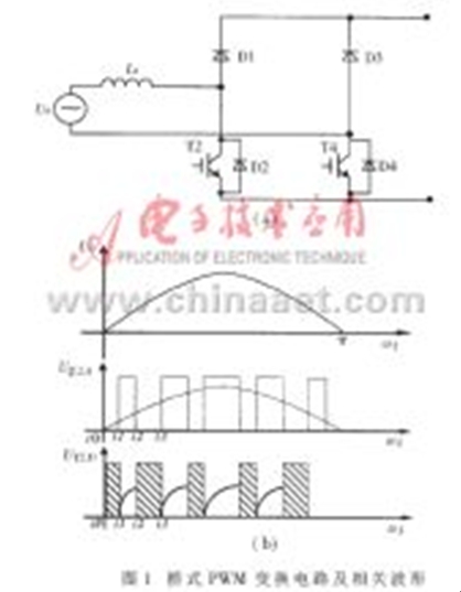 圖1(a)所示為工作在PWM整流狀態的H型橋式PWM變換電路(此圖為正弦波正半波輸入下的等效電路,上半橋的兩只IGBT未畫出),圖1(b)為下半橋兩只大功率器件的驅動信號和相關的器件波形?,F以正半波工作過程為例進行分析(對于三相PWM電路,在整流、逆變工作狀態或單相DC/DC工作狀態下,PWM電路的分析過程及結論基本類似)。
