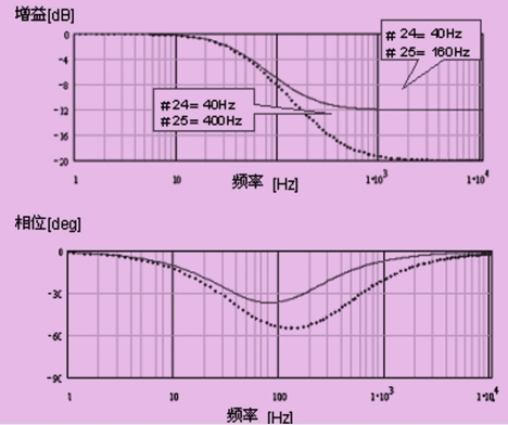 由圖1的bode圖可看出它比速度反饋濾波器多一個一階微分環節用于補償相位損失,參數#24對應積分常數,參數#25對應微分常數。并且最大增益衰減點頻率可設置,使相位滯后減到最小。另外,相對于陷波濾波器,它對抑制頻率范圍寬的諧振效果好,因其幅度抑制值小,對峰值高頻帶窄的諧振不合適。