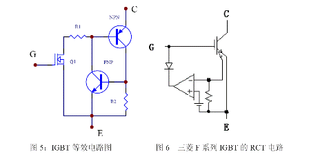 IGBT 有一定抗過電流能力,但必須注意防止過電流損壞。IGBT 復合器件內有一個寄生晶閘管,所以有擎住效應。圖5 為一個IGBT 的等效電路,在規定的漏極電流范圍內,NPN 的正偏壓不足以使NPN 晶體管導通,當漏極電流大到一定程度時,這個正偏壓足以使NPN 晶體管開通,進而使NPN 和PNP 晶體管處于飽和狀態,于是寄生晶閘管開通,門極失去了控制作用,便發生了擎住效應。IGBT 發生擎住效應后,漏極電流過大造成了過高的功耗,最后導致器件的損壞。