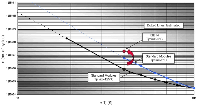 全新1200V IGBT4 功率半導體的最高允許工作結溫達到150°C,而其前代的最高允許工作結溫為125°C。