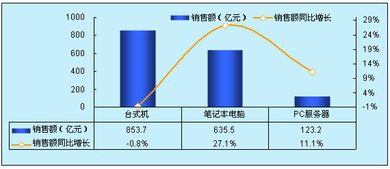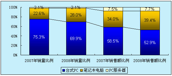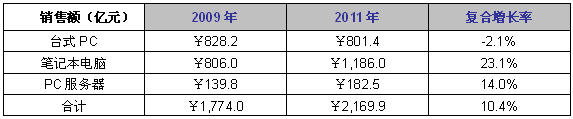 2009年中國IT市場年會上賽迪顧問發(fā)布的最新研究成果顯示,2008年,包括臺式PC、筆記本電腦和PC服務器在內的PCs市場銷量達到3218.5萬臺,同比增長15.2%,銷售額為1612.4億元,同比增長9.6%,增速相比上一年都有較大的下滑。其中,臺式PC與預期相比下降最大。