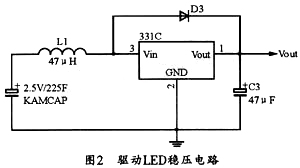 由于所選用的LED燈的額定電壓為3.3 V,而超級電容器的電壓為5.0 V,并且超級電容器在放電過程中電壓會不斷降低,因此需要有穩壓電路來驅動LED。