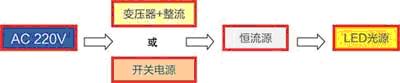 直流(DC)驅動LED光源發光的技術已經越來越成熟,由于我們日常照明使用的電源是高壓交流(AC 100~220V),所以必須使用降壓的技術來獲得較低的電壓,常用的是變壓器或開關電源降壓,然后將交流(AC)變換成直流(DC),再變換成直流恒流源,才能促使LED光源發光。因此直流驅動LED光源的系統應用方案必然是:變壓器+整流(或開關電源)+恒流源(圖1)。