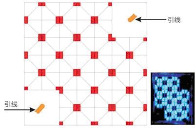 AC LED光源的重大技術突破是超細LED晶粒在封裝時的特殊排列組合技術,同時利用LED PN結的二極管特性兼作整流,半導體制程在其中扮演著相當重要的角色。AC LED通過半導體制程整合成一堆微小晶粒,采用交錯的矩陣式排列工藝,并加入橋式電路至芯片設計,使AC電流可雙向導通,實現發光。晶粒的排列如圖2所示,左圖是AC LED晶粒采用交錯的矩陣式排列示意圖,右小圖是實際AC LED晶粒排列照片,AC LED晶粒在接上交流后通體發光,因此只需要二根引線導入交流源即能發光工作。