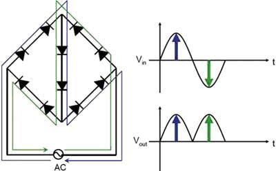 AC LED光源的工作原理如圖3,將一堆LED微小晶粒采用交錯的矩陣式排列工藝均分為五串,AC LED晶粒串組成類似一個整流橋,整流橋的兩端分別聯接交流源,另兩端聯接一串LED晶粒,交流的正半周沿藍色通路流動,3串LED晶粒發光,負半周沿綠色通路流動,又有3串LED晶粒發光,四個橋臂上的LED晶粒輪番發光,相對橋臂上的LED晶粒同時發光,中間一串LED晶粒因共用而一直在發光。