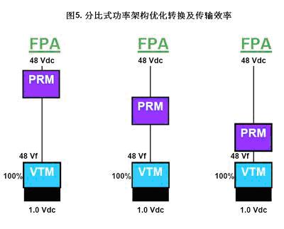 [page]由于VTM負責在負載點變壓,它的K比值最高可達到200,分比母線因此無須受負載電壓限制,可設定在任何一點上,甚至可把分比母線設定跟電源電壓相同。如圖5,負載電壓是1V,分比母線可設定為48V,完全不受負載電壓或PRM與VTM的距離影響,不需在輸送損耗與轉換損耗中折沖取舍。重點是FPA把變壓的部份放在負載點,克服了IBA面對的難題,占空比可達100%。