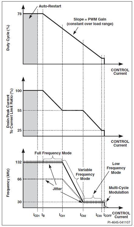 在高負載條件下,TOPSwitch-HX控制器工作于全頻PWM模式,此時用戶既可使用尺寸較小的元件,又可實現(xiàn)高效率。隨著負載的降低,控制器也降低頻率,從而降低開關損耗。它先切換到變頻模式,然后切換到頻率較低的固定頻率PWM模式。當負載極輕時,控制方式從PWM控制模式開始切換,并采用多周期調制控制算法。TOPSwitch-HX能根據經由光耦器饋入到控制引腳的反饋電流(圖1),自動在各控制模式間切換。