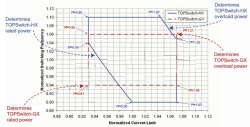 TOPSwitch-HX已解決了上述難題。TOPSwitch-HX引入額外的電路,并在最終測試中采用參數調整技術,以控制開關頻率與流限值平方的乘積的最大值和最小值,這在數據手冊中用一個新的參數來表征,即功率因數(I2f)。
