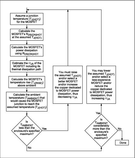 話說回來,TJ又依賴于MOSFET的功率耗散以及MOSFET的熱阻(ΘJA)。這樣,似乎很難找到一個著眼點。由于功率耗散的計算涉及到若干個相互依賴的因素,我們可以采用一種迭代過程獲得我們所需要的結果(圖1)。