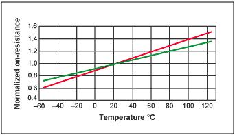 圖2.典型功率MOSFET的導通電阻的溫度系數在0.35%每度(綠線)至0.5%每度(紅線)之間