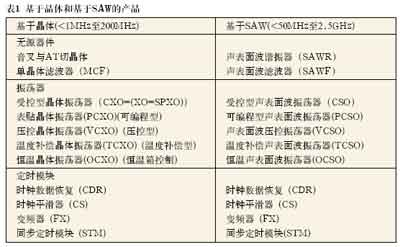 在有線與無線市場迅猛增長的推動下,石英晶體及其高頻版SAW器件正廣泛用于各個領域,小到電子玩具中簡單的無源石英晶體,大到用于最先進的電信網(wǎng)絡骨干網(wǎng)定時的復雜同步定時模塊(STM),如表1所示。
