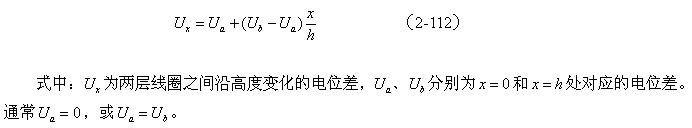 設圓柱形兩層線圈之間的距離為d,高度為h,平均周長為g 。假定兩層線圈之間沿高度的電位差為線性變化,即: