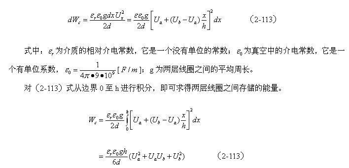 設兩個線圈相對應的兩表層間的電場近似均勻分布,即近似平板電容器的電場,那么,根據(jù)(2-112)式就可以求得該電場貯存的能量為: