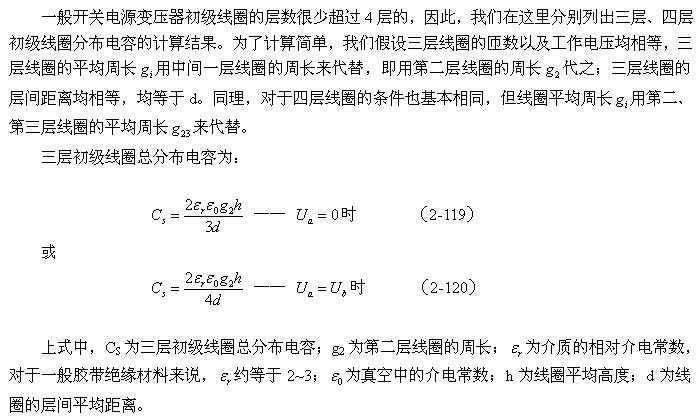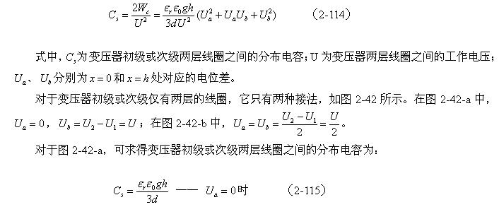 對于圖2-42-b,可求得變壓器初級或次級兩層線圈之間的分布電容為: