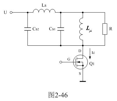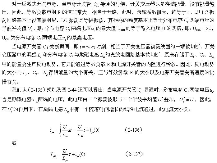 在圖2-46中,Cs1、Cs2都是分布電容,它們對于漏感 來說,既可以產(chǎn)生串聯(lián)振蕩,又可以產(chǎn)生并聯(lián)振蕩。在電源開關(guān)管Q1導(dǎo)通瞬間,漏感與分布電容主要是產(chǎn)生串聯(lián)振蕩,因為輸入電壓開始向串聯(lián)振蕩回路提供能量;在電源開關(guān)管Q1關(guān)斷瞬間,漏感與分布電容主要是產(chǎn)生并聯(lián)振蕩,因為漏感 必須要通過并聯(lián)回路釋放能量。在實際應(yīng)用中,漏感相對于勵磁電感 來說很小,因此如果不考慮漏感的作用,完全可以把Cs1、Cs2看成是一個分布電容。