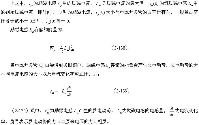 (2-140)式對于計算漏感 產(chǎn)生的反電動勢或其它電感產(chǎn)生的反電動勢同樣有效。漏感 中存儲的能量可根據(jù)(2-138)式求得;而流過漏感 的電流,對于反激式開關(guān)電源:可認為與勵磁電流的大小基本相等,因為,在反激式開關(guān)電源中,等效負載電阻等于無限大;對于正激式開關(guān)電源:可認為與流過等效負載電阻的電流大小基本相等,因為,在正激式開關(guān)電源中,勵磁電流相對于流過等效負載電阻的電流,很小。