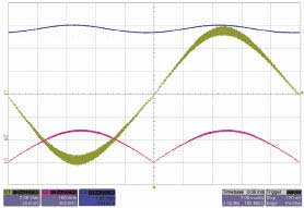 此外,它的功率要求很低,既提高了效率也降低了組件成本。該PFC還帶有峰值限流、輸入電壓中斷保護功能,還有一個過壓比較器,可在發生負載突然減小事件時關斷PFC部分。時鐘輸出信號可用來同步下游的PWM級,以減少系統噪聲。圖3中,綠色曲線的較厚區域代表電流紋波,PFCIC在峰值輸入電壓下消耗電流較多,過零時沒有電流。粉色曲線代表整流器輸入電壓,藍色曲線為輸出電壓。