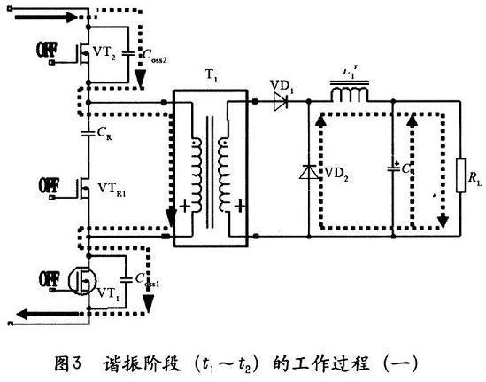 2)諧振階段(t1~t2),如圖3所示,在占空比的控制下,第一主開關(guān)管VT1和第二主開關(guān)管VT2在t1時(shí)刻同時(shí)關(guān)斷,變壓器磁芯極性反轉(zhuǎn)。因輸入電源和變壓器的勵(lì)磁電感的作用給VT1和VT2的寄生電容COSS1,COSS2充電,由于電容電壓不能突變,第一主開關(guān)管VT1和第二主開關(guān)管VT2在ZVS狀態(tài)下關(guān)斷。同時(shí)變壓器的勵(lì)磁電流開始給鉗位開關(guān)管VTR1的寄生電容COSS放電,經(jīng)VTR1的體二極管給鉗位電容CR1充電。次級(jí)VD1截止,VD2導(dǎo)通,L1經(jīng)過VD2續(xù)流繼續(xù)給負(fù)載RL供電。