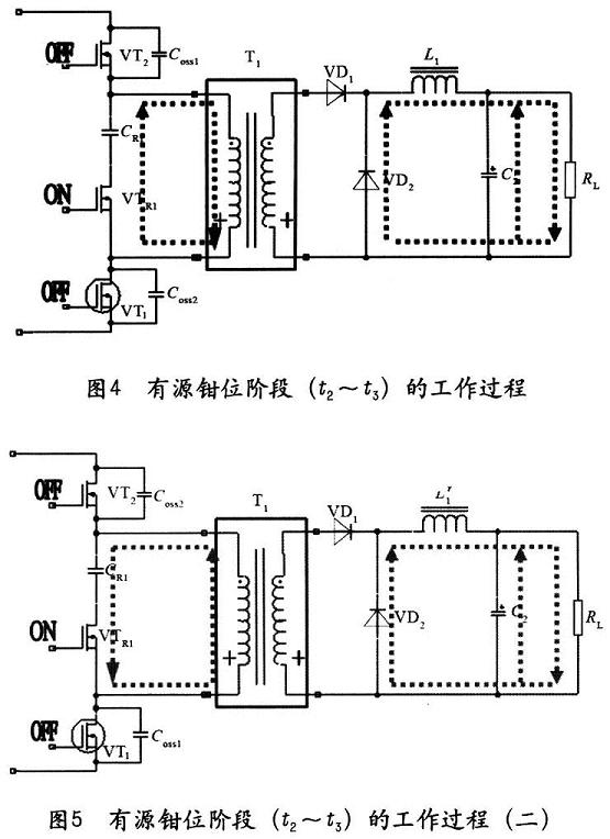 3)有源鉗位階段(t2~t3),如圖4和圖5所示,在亡2時(shí)刻鉗位開關(guān)管VTR在ZVS狀態(tài)下開啟,由于VTR1的體二極管先前已開通,VTRl的UDS電壓很低。鉗位開關(guān)管VTR1在整個(gè)階段處于開通狀態(tài),變壓器勵(lì)磁電流經(jīng)過鉗位開關(guān)管VTR1繼續(xù)給鉗位電容CR1充電,鉗位電容CR1充滿以后經(jīng)變壓器勵(lì)磁電感放電。次級(jí)在整個(gè)階段由L1續(xù)流經(jīng)VD2給負(fù)載供電,VD1截止。