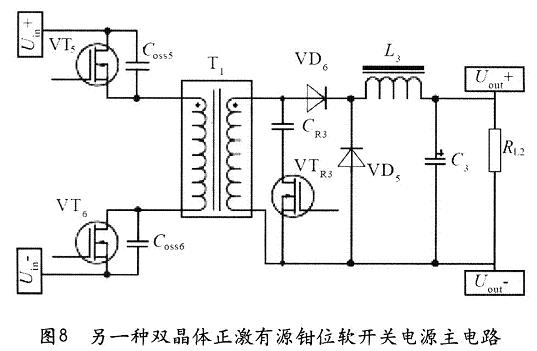 雙晶正激有源鉗位軟開關(guān)電源還有另一種結(jié)構(gòu),如圖8所示。其結(jié)構(gòu)與圖1所示的雙晶正激有源鉗位軟開關(guān)電源基本相似,只鉗位開關(guān)管VTR3以及鉗位電容CR3設(shè)置在副邊,鉗位電容CR3一端與變壓器的同名端相連,另一端與鉗位開關(guān)管VTR3的D極相連,鉗位開關(guān)管VTR3的S極與變壓器的異名端相連,請參閱圖8。其工作原理同在初級(jí)鉗位相差不多,這里不再講述。