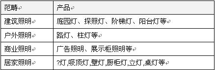 隨著技術(shù)的改善,LED燈具的用途已由過去數(shù)十年單純應(yīng)用在指示燈、信號燈等,逐步使用在手機(jī)背光源、車內(nèi)用照明、煞車燈、LCD電視、手提電腦背光源等輔助照明;而在近兩年內(nèi),其開始成為主照明系統(tǒng),所應(yīng)用的范疇可涵蓋建筑、戶外、商業(yè)、及居家等,產(chǎn)品則分別有: