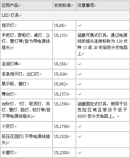 以下首先針對LED燈具、LED燈泡及LED驅(qū)動器等三種基本產(chǎn)品分類,及其分別沿用至各成品或零件時,所應(yīng)參考的UL安規(guī)標(biāo)準(zhǔn)及應(yīng)特別注意事項,以做為業(yè)者欲進(jìn)行產(chǎn)品安規(guī)檢測的基本指南。不過該表僅供讀者參考,產(chǎn)品實際的歸類,仍須依產(chǎn)品的用途及其使用環(huán)境來決定。