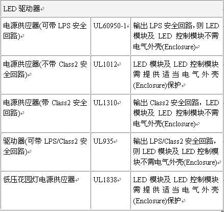 4.其它要求:如LED電源、LED數(shù)組、LED模塊及LED控制模塊等安全及外殼要求等。LED的電源可以是下列標(biāo)準(zhǔn)所驗證的電源供應(yīng)器,包括UL1012,UL1310及UL60950-1。基本上,LED數(shù)組、LED模塊及LED控制模塊只要位于LPS/Class2安全回路上,就沒有任何電氣外殼的要求。LED燈具對于電源輸出方式的規(guī)定為基本絕緣,與完全沒有隔離是一樣的。對于LED數(shù)組、LED模塊及LED控制模塊,如果使用的電源不用大到超過LPS/Class2,建議最好要符合LPS/Class2。反之,若使用的能量將大于LPS/Class2,則有沒有提供隔離一次側(cè)與二次側(cè)電源電路的絕緣,對塑料外殼的要求上,是沒有差別的。
