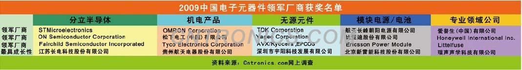 2009中國(guó)市場(chǎng)電子元器件領(lǐng)軍廠商評(píng)選活動(dòng)隆重亮相,在社區(qū)網(wǎng)友的積極參與下,經(jīng)過激烈的網(wǎng)上投票和打分,令人翹首期盼的獲獎(jiǎng)名單終于震撼登場(chǎng),共有16家中外企業(yè)最終獲得“2009中國(guó)市場(chǎng)電子元器件領(lǐng)軍廠商”稱號(hào),另有五家本土企業(yè)分獲“2009中國(guó)市場(chǎng)電子元器件最具成長(zhǎng)性公司”稱號(hào)。