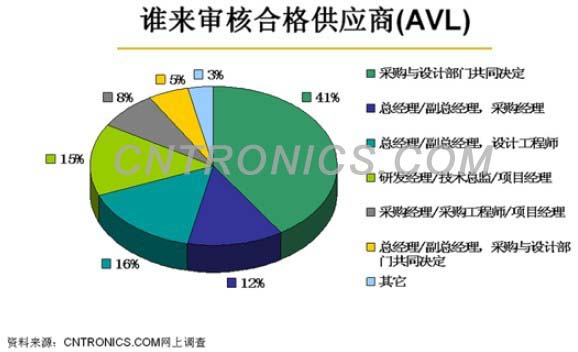 誰能審核和最終決定合格供應(yīng)商名單呢?這是電子元器件制造商和分銷商最為關(guān)心的問題,從調(diào)查數(shù)據(jù)中可以看出,決策權(quán)并不限于某一個(gè)部門。趨于四成的公司審核和決定合格供應(yīng)商名單(AVL)是由采購(gòu)與設(shè)計(jì)部門共同決定,由采購(gòu)部門單獨(dú)決策的不足一成;而由研發(fā)部門單獨(dú)決策的僅為15%,由此可見,在電子產(chǎn)品開發(fā)速度加快和上市時(shí)間日趨壓縮的背景下,電子行業(yè)的采購(gòu)與研發(fā)的合作關(guān)系日趨緊密,采購(gòu)部門更多的參與到產(chǎn)品開發(fā)的過程中,在提供成本預(yù)測(cè)、確定替代供貨源和降低成本方面扮演著重要角色。此外,通過調(diào)查還發(fā)現(xiàn),多個(gè)部門共同決定元器件采購(gòu),已經(jīng)成為業(yè)界采購(gòu)流程的發(fā)展趨勢(shì)。除研發(fā)和采購(gòu)部門外,公司總經(jīng)理等決策高層也更多的關(guān)注和參與到電子元器件采購(gòu)中。