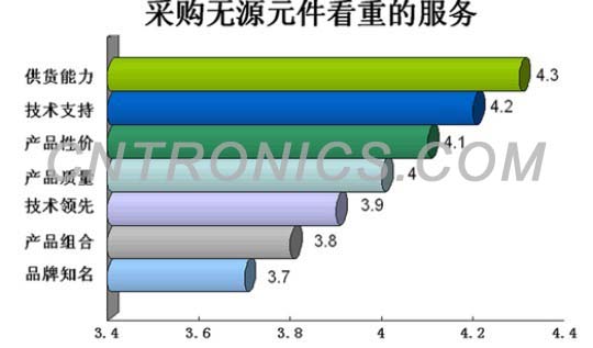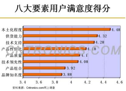 從柱狀圖可以看出,性價(jià)比、技術(shù)支持和供貨能力普遍得分很高。而產(chǎn)品組合和品牌知名度普遍得分較低。由此可見,在金融危機(jī)影響依然持續(xù)的情況下電子整機(jī)廠商更加重視電子元器件的供貨能力和技術(shù)支持能力。[page]