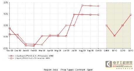 10月份振蕩器的平均現貨市場價格是1.42美元,合同價格是1.17美元。有一些跡象表明2010年第一季度需求將放緩,而供應將會改善。這種趨勢可能使該市場恢復供需平衡。第四季度振蕩器的合同價格預計將持穩,2010年第一季度下降0.2%。