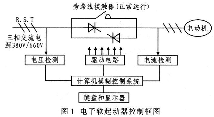 軟起動有磁控降壓軟起動器和電子軟起動器。其中,磁控降壓軟起動采用控磁限幅調(diào)壓方式減壓調(diào)控電動機(jī)起動時的電壓,實質(zhì)就是電抗器降壓起動。電子軟起動器有晶閘管調(diào)壓軟起動和變頻器調(diào)速軟起動。晶閘管調(diào)壓軟起動器的主回路采用6只晶閘管兩兩反向并聯(lián)組成的調(diào)壓電路,并焊接于電動機(jī)的三相供電線路。當(dāng)起動器的微機(jī)控制系統(tǒng)接收到起動指令后進(jìn)行有關(guān)計算。輸出晶閘管的觸發(fā)信號,通過控制晶閘管的導(dǎo)通角起動器按所設(shè)定的模式調(diào)節(jié)輸出電壓,從而控制電動機(jī)的起動。當(dāng)電動機(jī)起動完成后,起動器吸合旁路線接觸器,使晶閘管短路,電動機(jī)直接投入電網(wǎng)運行,避免不必要的電能損耗。圖1為電子軟起動器控制框圖。