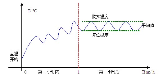 以單相馬達與自動復位熱保護器組合為例說明,其他情況請查閱相關標準。測試在室溫環境進行,堵轉72小時,其間熱保護器必須因繞組溫度升高斷開電路又自動復位,儀器連續記錄繞組溫度,圖-1的示意圖由經驗所得。整個過程到結束,必須符合以下結果: